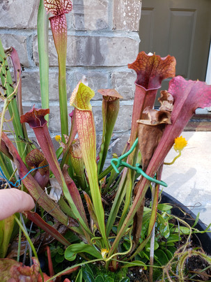 Sarracenia Bugbat is an popular medium sized hybrid ( rubra x minor). It’s red tubular pitchers remind people of a baseball bat giving it it's nickname. The pitcher’s mouth is covered by a hood. I was hesitant to look into the bugbat because of the hood, but if you fold the hood’s lip in, the pencam fits in nicely. Bugbat is an excellent ant catcher.